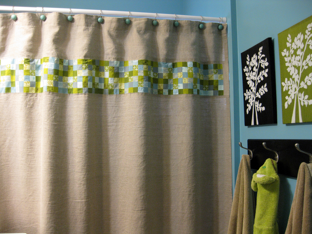 I made a patchwork shower curtain for this bathroom ages ago. I love it! It nicely pulled together all the colors in the room. While the shower curtain is still going strong, those ferny wall prints fell victim to the war on mold. Sad face.