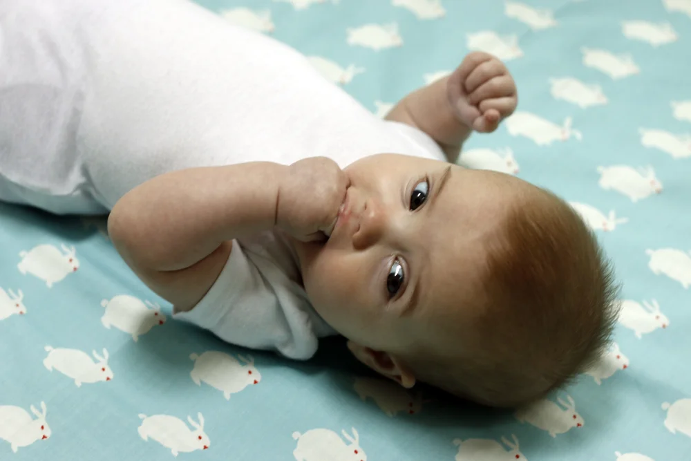 This month baby is photographed on Birch Organic's White Rabbit, in stock now at Bobbie Lou's Fabric Factory!