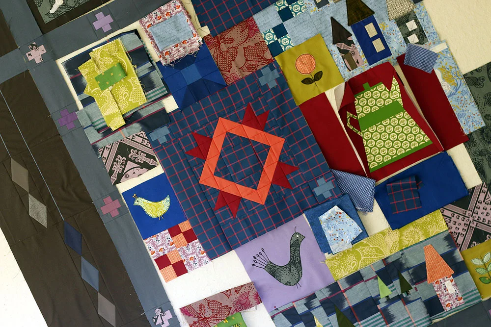 And here are my tea cups! Love, love! They are such fun to make. Ok, the handles are not fun to make, as they have a trillion parts, but choosing fabrics for cups and saucers is such fun. Gosh, wouldn't a whole quilt of cups would be darling? I did simplify the handle on the blue floral cup, giving it sharper angles. I like how that worked out. If I were to make them again, I'd choose to use white for the rim of that cup though. I used a medium blue that doesn't show up with the saturated Friedlander blue background. Live and learn.