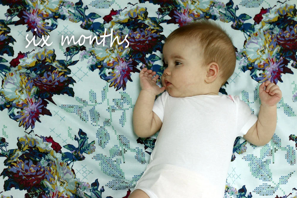 This month baby is photographed on Mod Corsage by Anna Maria Horner, in stock now at Quilt Sandwich!