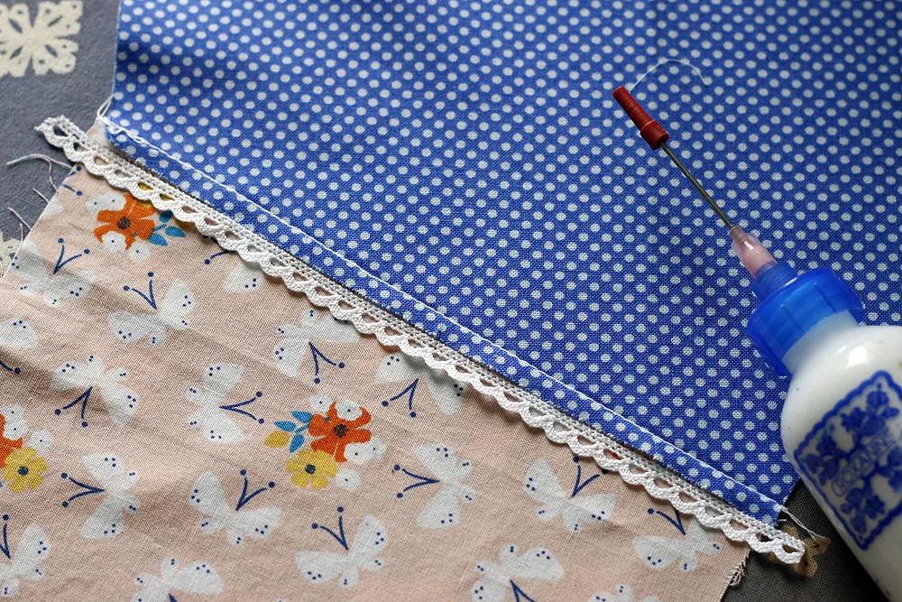 I enjoyed adding trims, something we don't often get to play with in quilting. The pattern was not written for French seams, but it didn't require any modifications to go that route. After sewing the first seam, I used Roxanne's glue baste to stabilize that tiny lace trim (Frou Frou lace from The Confident Stitch). Using glue is way easier than trying to pin the wee thing. After basting the trim, I sewed the final French seam. Worked quite well!