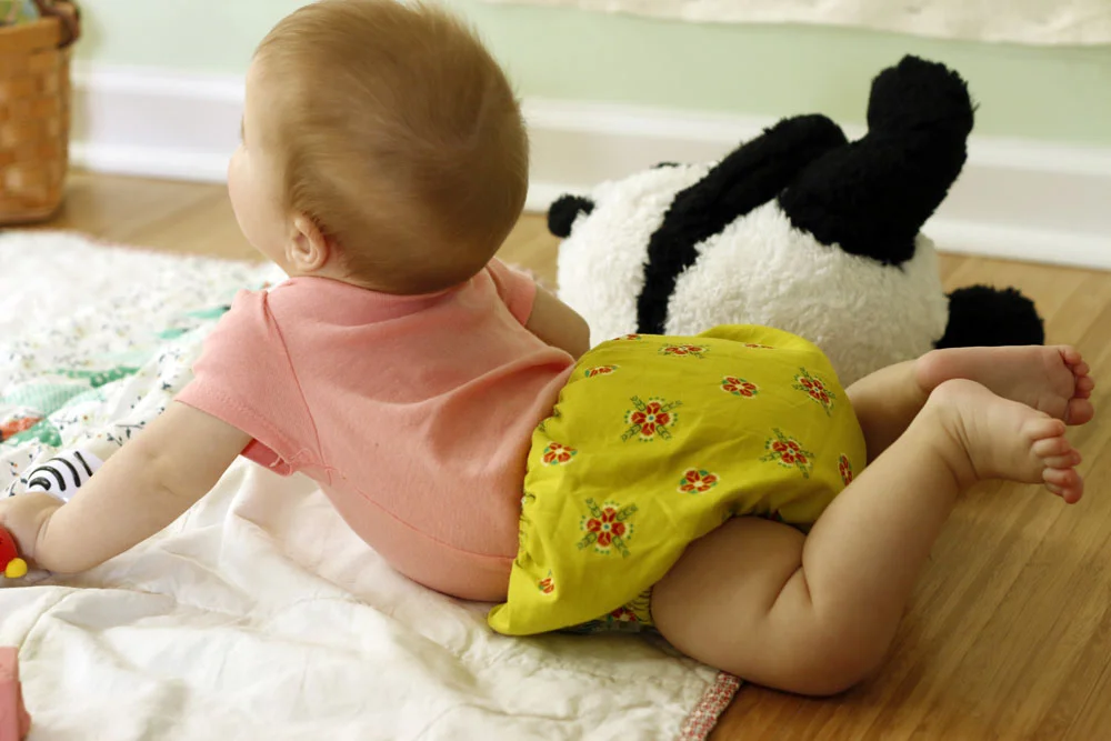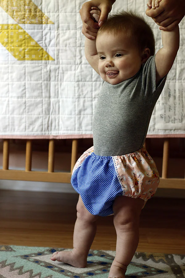 I made size 9-12 months, which have a roomy fit even over a cloth diaper. Rora is almost 7 months, but wearing a cloth diaper often bumps her up a size. With this pattern, she could have worn 6-9 months. Oh well, maybe they'll still fit next year? You see, she wears one-size cloth diapers so they won't get much bigger and her bum probably won't either!
