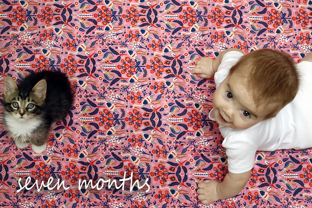 I think she likes nothing more than to find herself on the floor with the kittens playing nearby.  She talks to them some, but mostly she squeals with delight - a little laugh-squeal that is completely irresistible.  I simply cannot put them outside yet.  I don't think they'll be as happy inside when Rora starts to chase after them, even at a snails pace.  Maybe that will be the time to ease them into their new wide world.