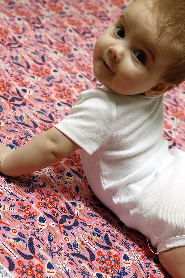 This month baby is photographed on Les Fleurs Tapestry by Rifle Paper Company in stock now at Quilt Sandwich!