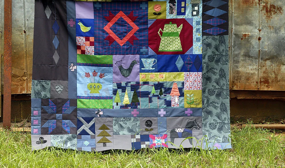 One of my last contributions to the finished quilt top was the Flower Pot block. I used a Carolyn Friedlander blue background and fussy cut a favorite diamond print fabric to make the pot's diamonds extra special. This paper pieced block is very detailed and rather time consuming. I tell my students that when you finish it you'll know you can paper piece anything!