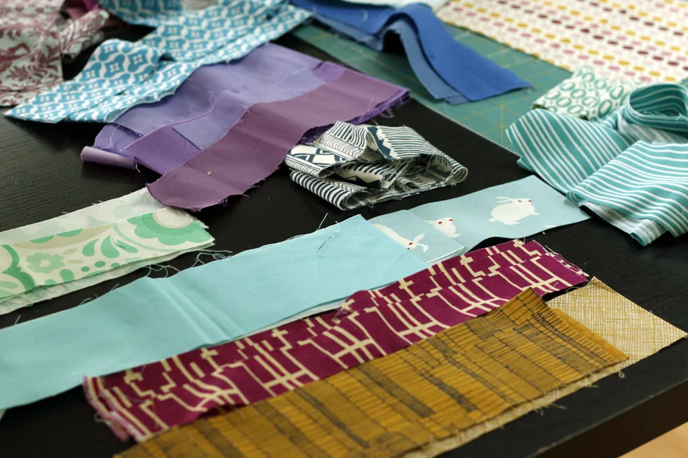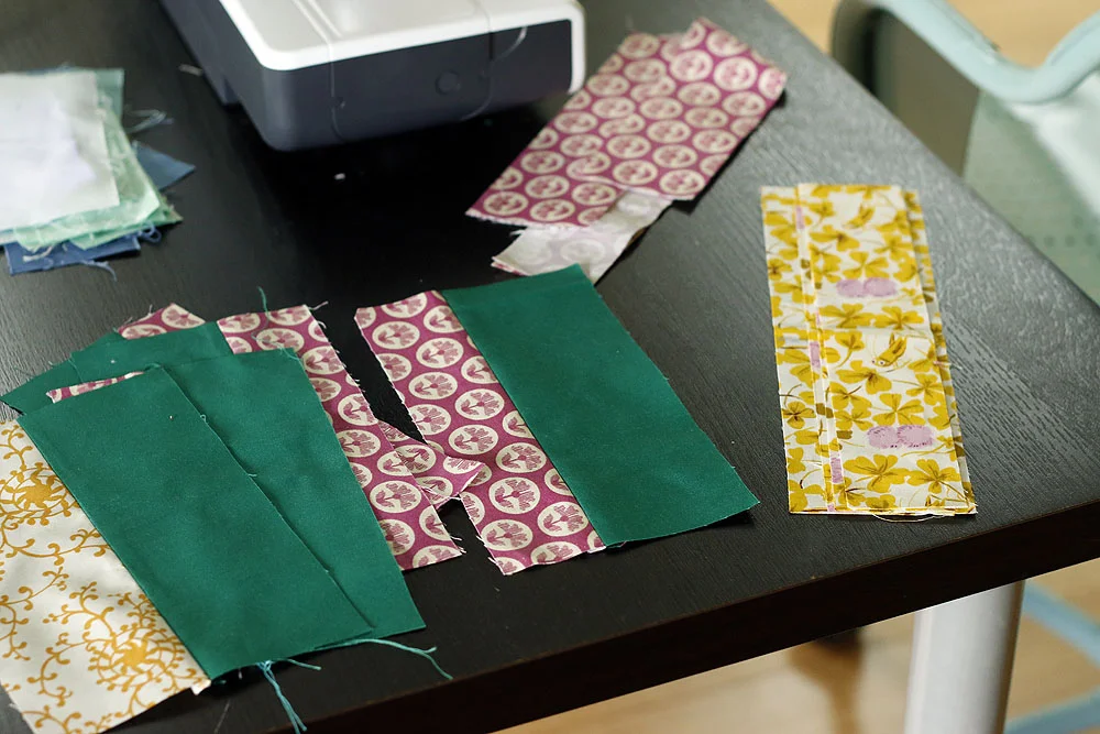 Now I'm choosing 3 colors at a time to sew side by side in coin quilt fashion. It's quick and allows a bit of play with color and proportion.