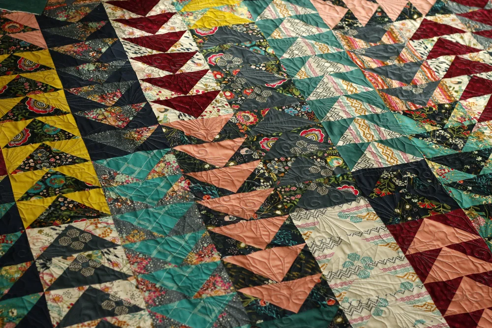 Woohoo! I've finished a quilt on the very first day of the year! Surely that's good luck? Today I finished quilting my Indie Geese quilt on our longarm quilting machine. I bound it in quilt-back trimmings with my favorite and super quick zigzag machine binding. Here it is!