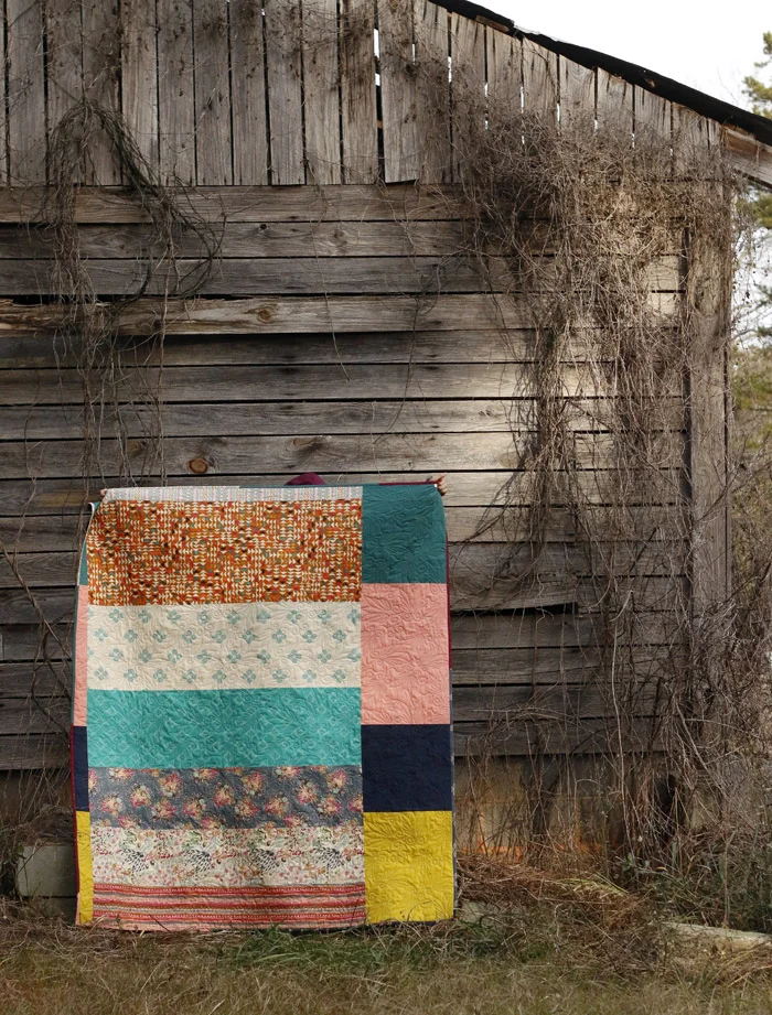 I made this quilt entirely of Art Gallery fabrics: Pat Bravo's Indie Folk and Pure Elements solids. Even the backing! I wanted to see how a quilt made 100% of Art Gallery would feel. To me it seems slightly lighter than usual and a little crisp, with a lovely luster. I expect the crispness will soften with washing.
