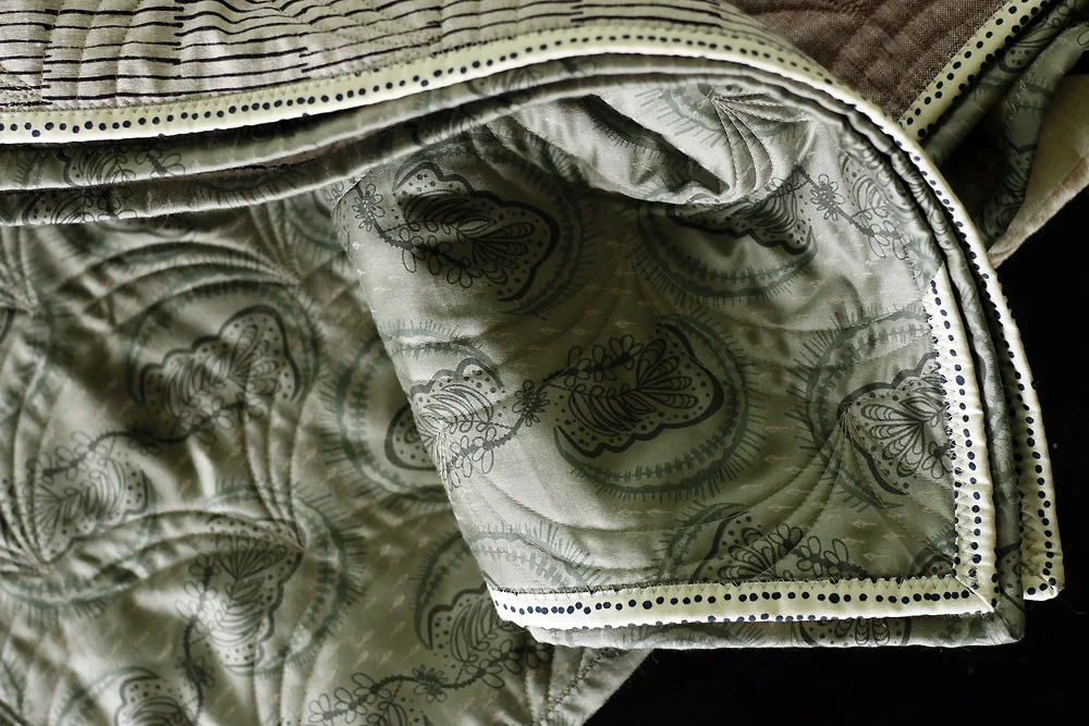 Inspired by Fancy Tiger Craft's Double Star quilt pattern, I made this quilt using my understanding of half square triangle blocks. I adapted the dimensions of the double star to fit a twin sized bed, adding extra fabrics at the top and bottom of the work so that the star would fall beautifully on the bed itself.