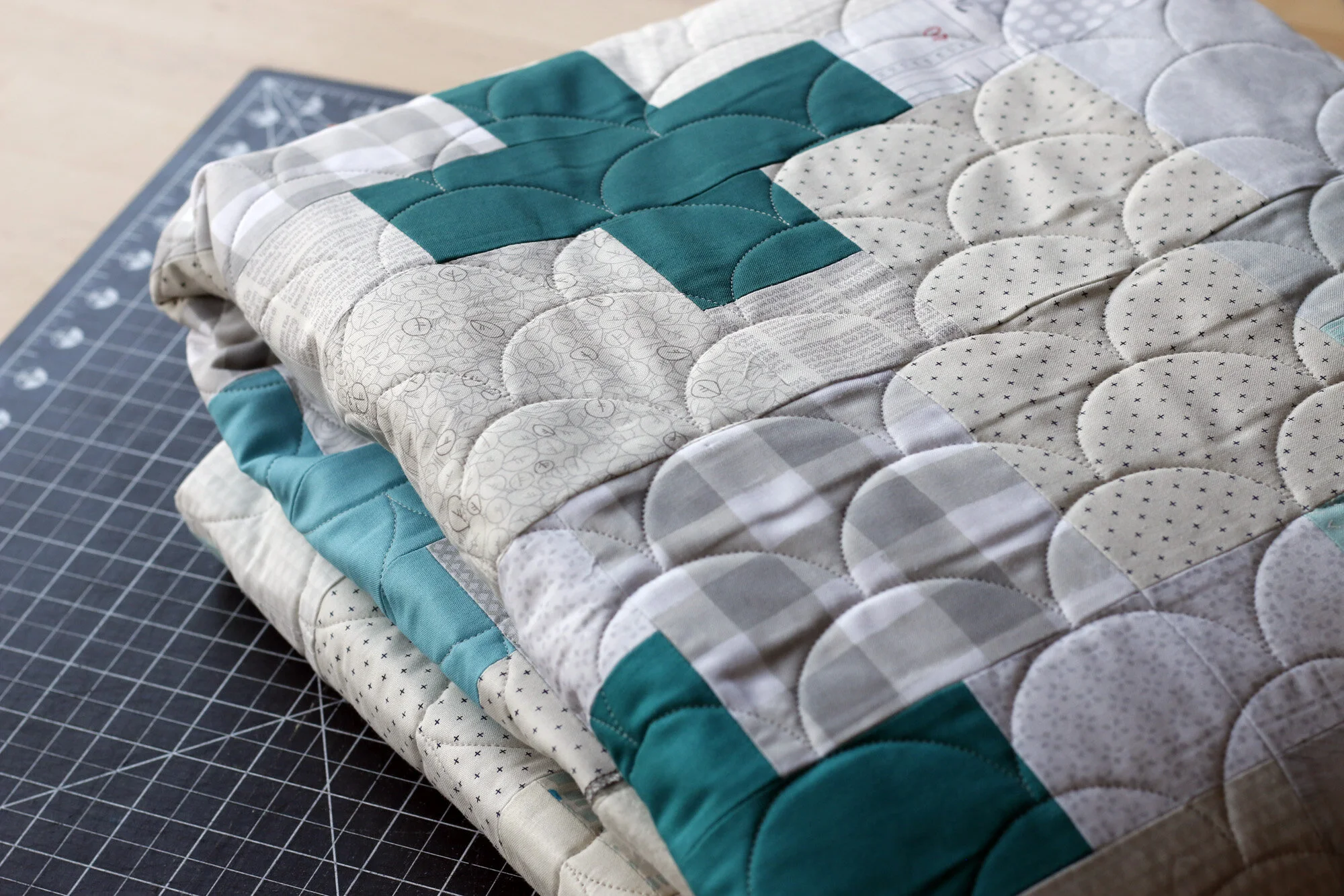 Some quilts aren’t mean to turn heads as much as to cultivate serenity. Dagmar’s quilt is just that kind. She drenched aqua and teal in buckets of low volume fabrics, so that the patchwork has a floaty, dreamy quality. Dagmar @miss_emmi w chose clamshell all-over quilting for her project. Such a good idea! The soft, even curves blend well with the tone of the work.