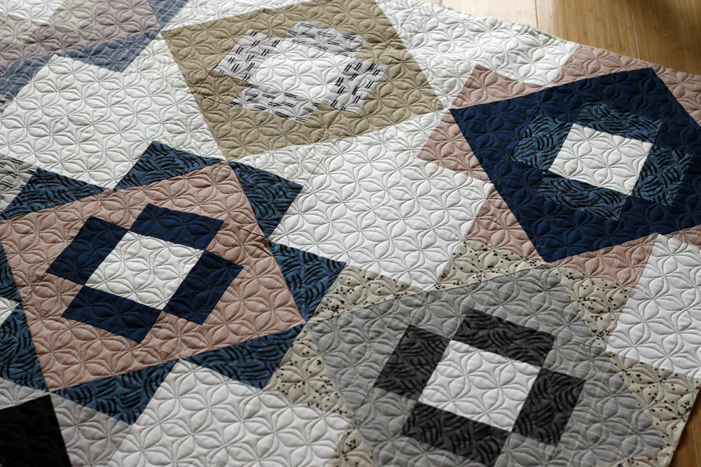 This is Bread Basket quilting, from my Rounded Geometric design group. Scroll back and forth between this quilt and Mary’s version. Notice that Julia’s is quilted much less densely, as she wanted to prioritize a cuddly quilt. This might help you understand if you prefer open vs. dense quilting.