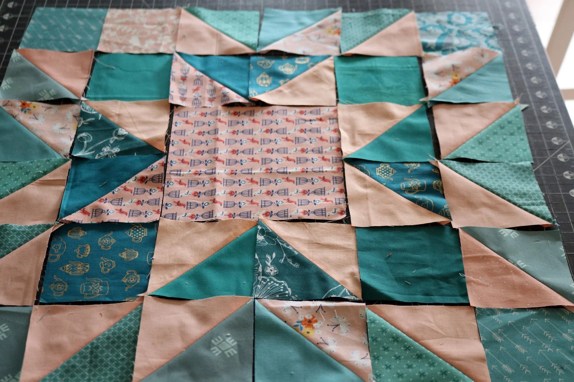 Then get to work makings half square triangles. The honorable HST block is simple, but mighty. Luckily I don’t have to make a quilt-full because that would become tedious. Nope, I just put my head down for a bit and enjoy a good batch and before I know it this happens: