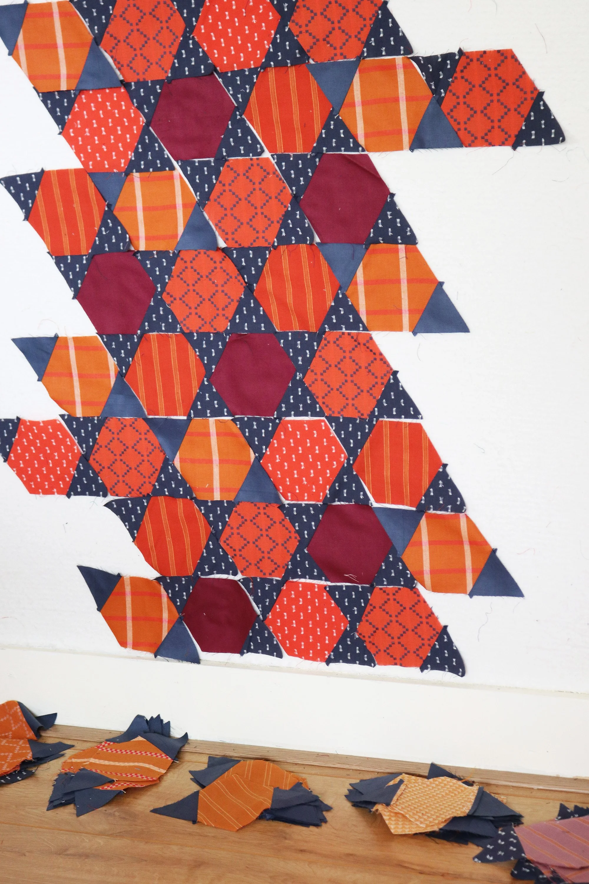 This low value group includes some half hexagons. Even though it’s my own pattern, I still got nervous cutting some of my beautiful hexagons in half to make these blocks, haha. Don’t be alarmed. It’s correct!