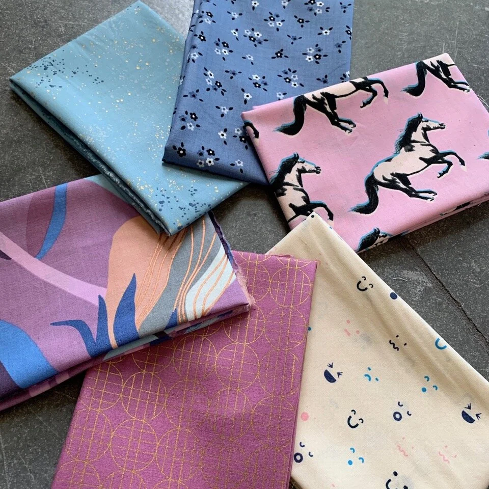 This month the Cool Pastel bundle is up for grabs! It’s a 6-piece fat quarter bundle, cut in generous 22” x 19” slices. The colors coordinate beautifully, while the patterns have a pleasing variety of pattern scale and type.