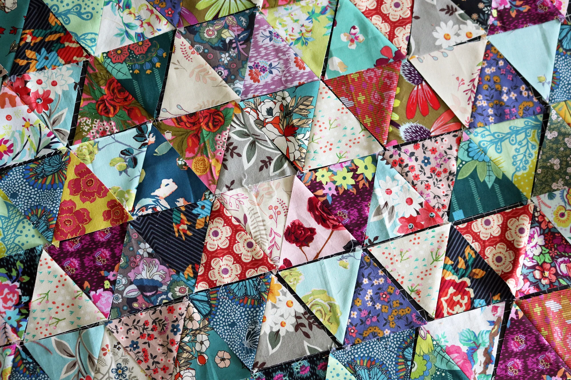 To create my scrappy patchwork, first I sewed all triangles as pairs. This results in diamond-shaped units that are easy to manipulate. Pairing triangles is not at random for me. Instead I chose pairs that seemed to compliment each other, hoping to create little movements of rhythm within the chaos.