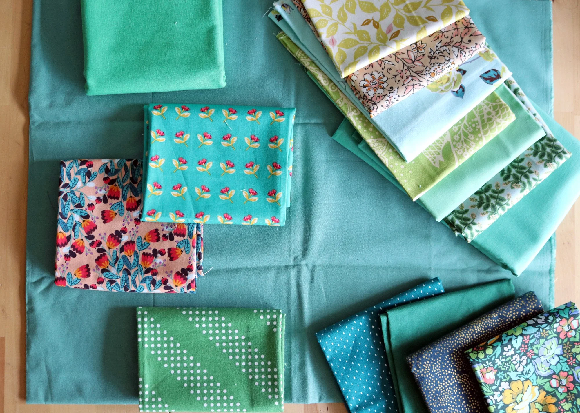 To start, I pull fabrics from my stash with a pretty, floral vibe. There are greens, teals and yellow-greens, plus a bit of peach thanks to that peach/teal floral near top center called Magnolia florals by Cotton + Steel. Love that one! A good dose of solids and basics brings a sense of serenity to the collection.