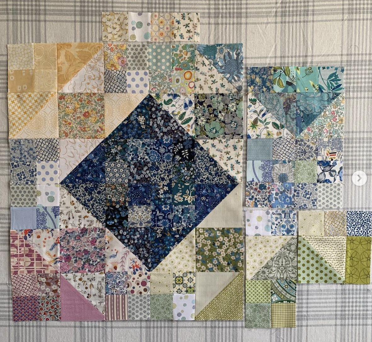 Celebrating:: I was excited to come across a perfectly delightful Pas de Deux work in progress by @QuiltKat this morning. She’s completely broken the mold! First take a good look at her February blocks (left). She’s sewn each corner of this patchwork group in a different color: yellow, aqua, green and purple. Dark navy grounds the center. She’s used a lot of diverse Liberty scraps, which set a happy, yet soft tone.