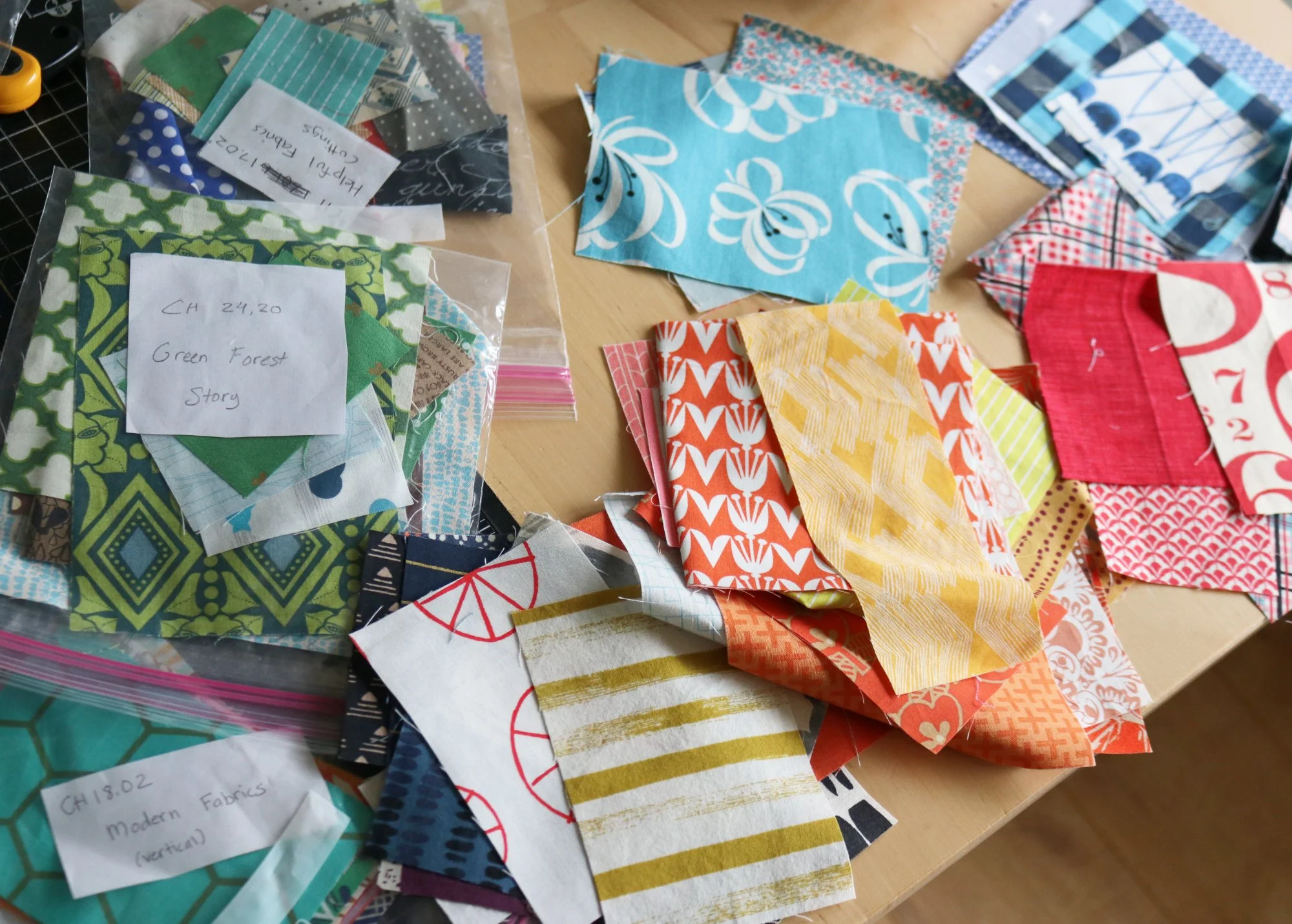 Whenever I move house I am confronted by all the bits and bobs of potential projects stashed away in my sewing room. One such nest of sparkly potential is the fabrics I cut for my book, The Quilter’s Field Guide to Color.