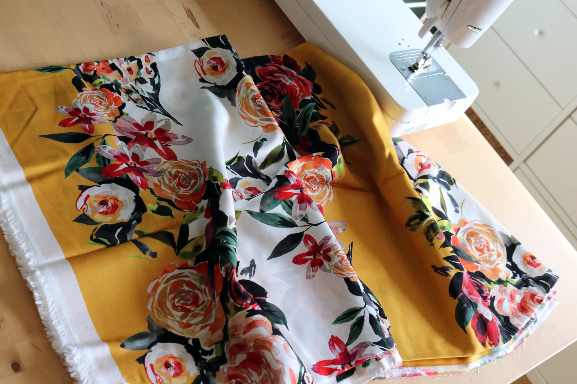 That was definitely my response when I spotted this gorgeous mustard yellow and white rayon fabric at The Confident Stitch. The scale of the flowers is so nice and the colors are sublime. I figured that the print’s big bands of color could really be cool as a fluid blouse - - -