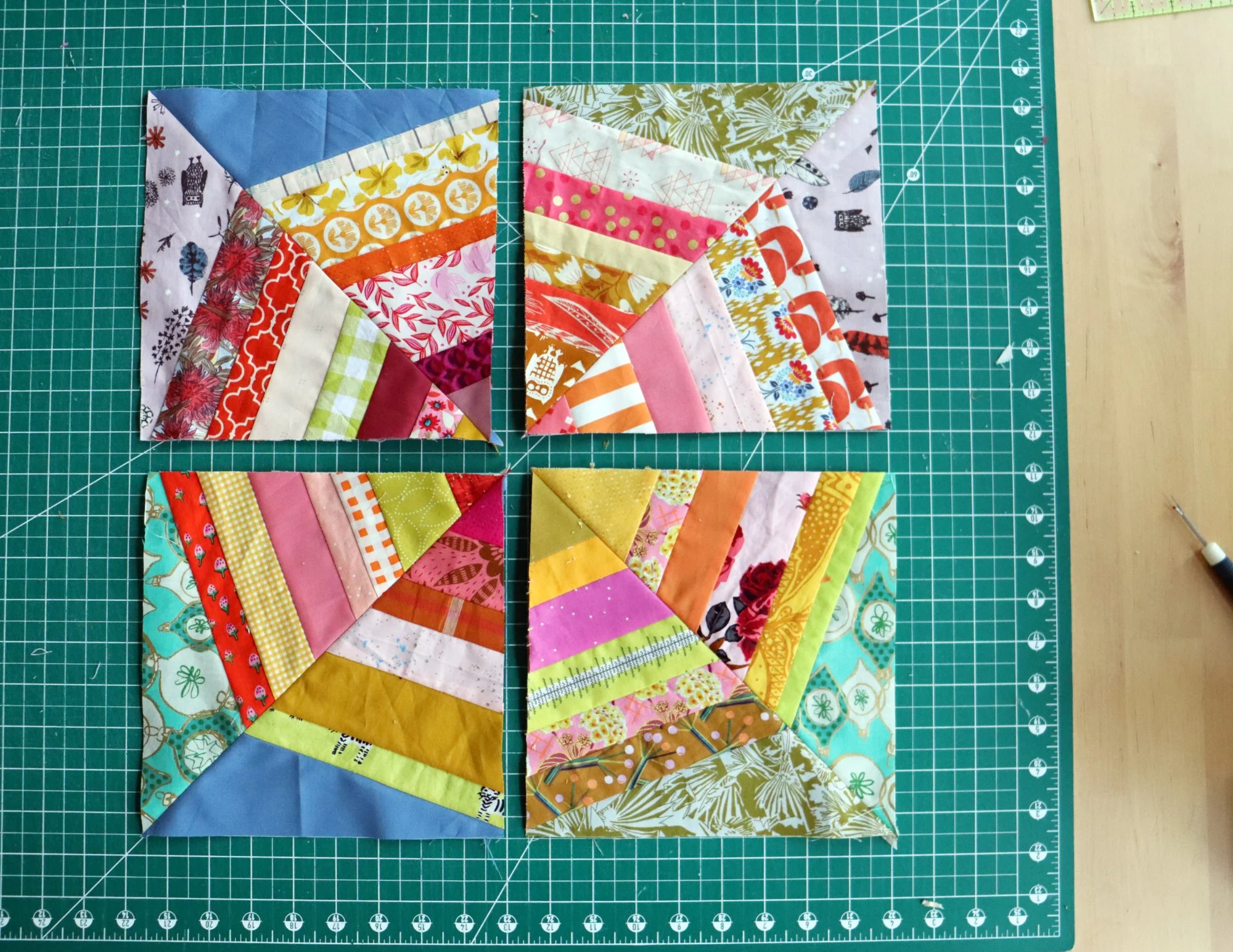 Just as with string blocks, you want to press after sewing each string scrap onto the fabric foundation. If you work on all the foundations at once, adding a strip to each at a time, then it’s not as much back and forth from the sewing machine to the pressing board.