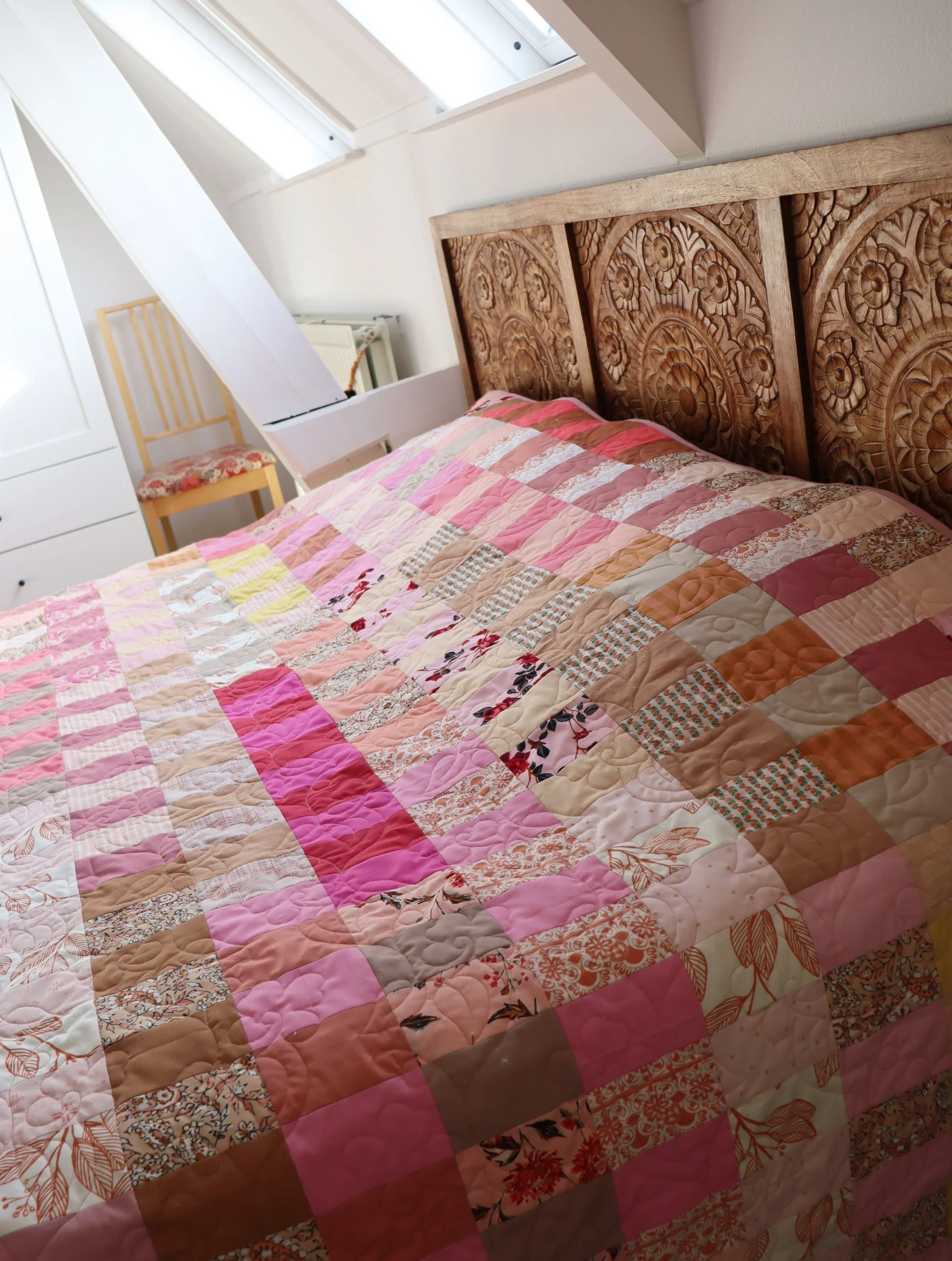 I especially love it with the carved headboard. I used several shades of brown in the quilt with that headboard and my future wooden floors in mind. Floris says the quilt gives the vibe of a bronze and pink goddess. =)