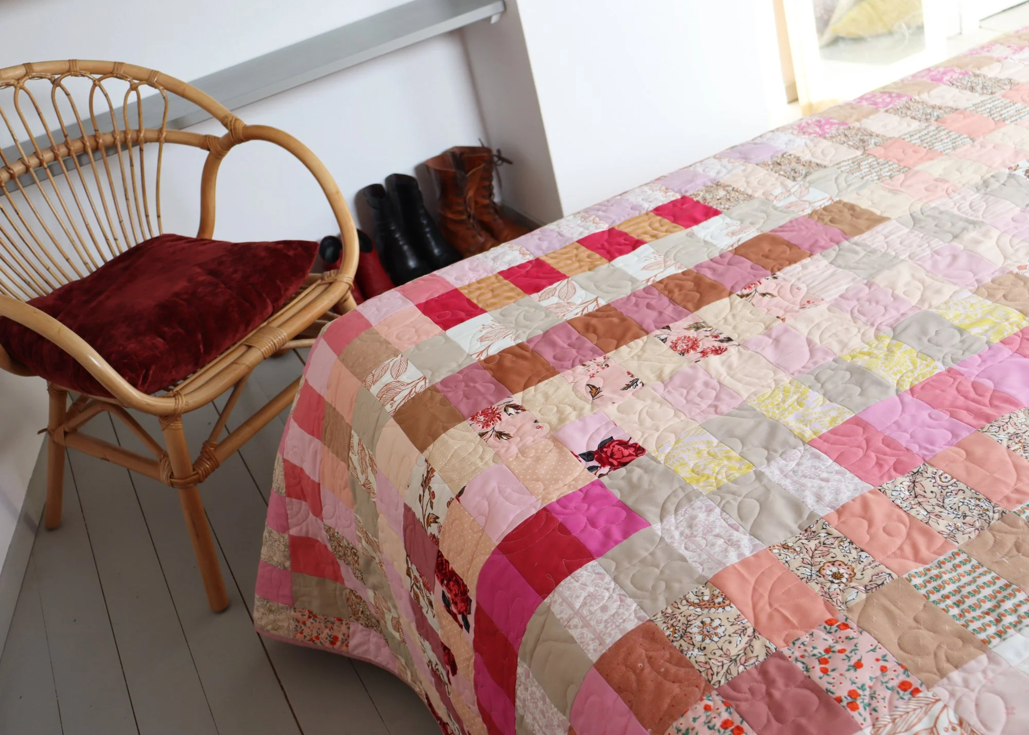 Of course, as soon as it was finished I gathered it up and hauled it upstairs to spread out on my bed. Even though this quilt is made for my future bedroom, with Rangwali pink walls, it does already make me smile right here.