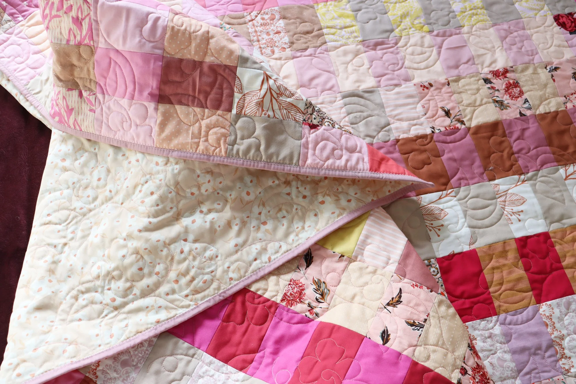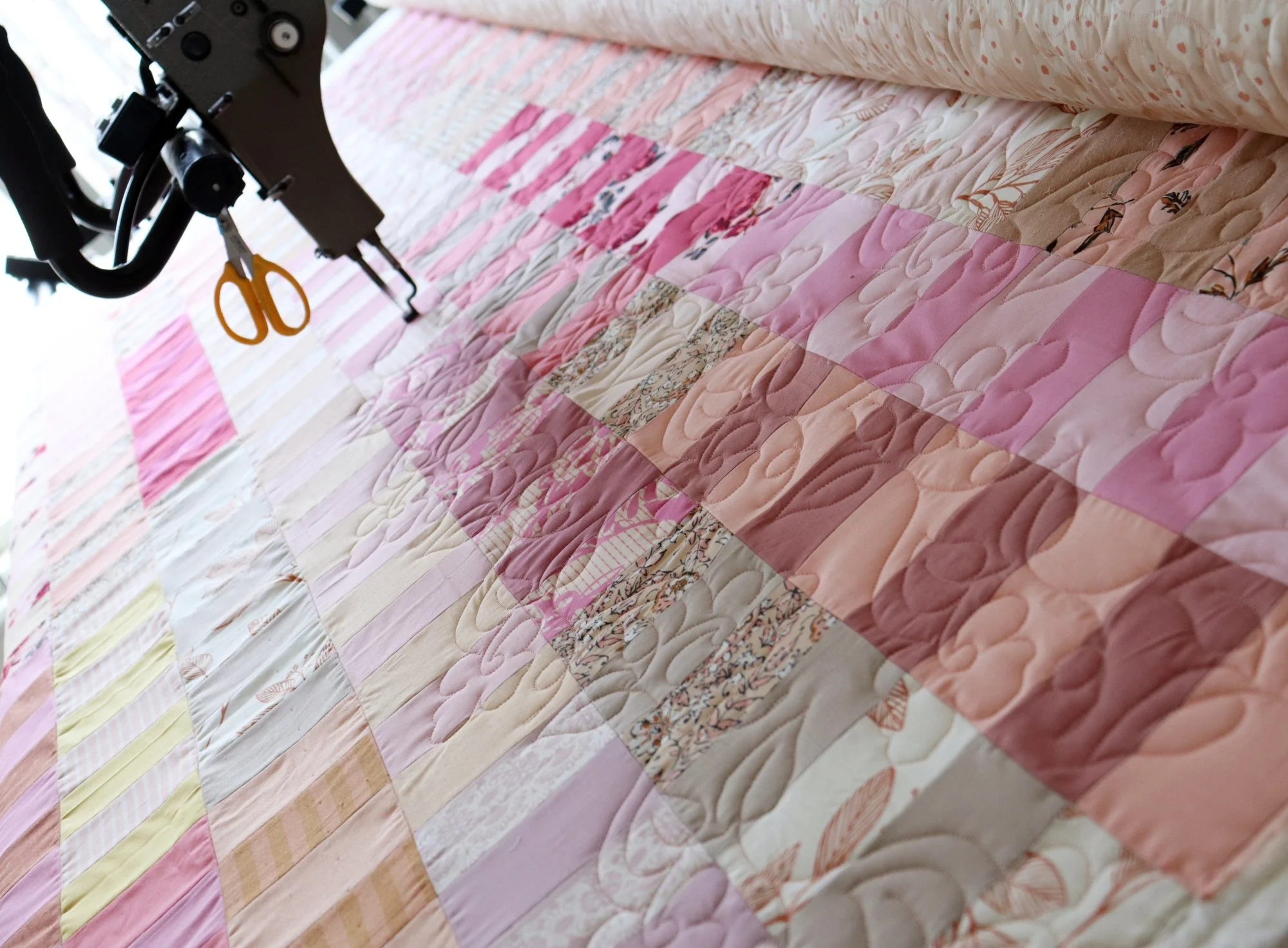 It wasn’t hard to choose a quilting pattern for this quilt. As a coin quilt, Rosie is made up of endless simple, stacked rectangles. So many straight lines ask for a quilting pattern with organic shapes. I chose Pansy, a pretty floral pattern that quilts out less densely than some of the others.