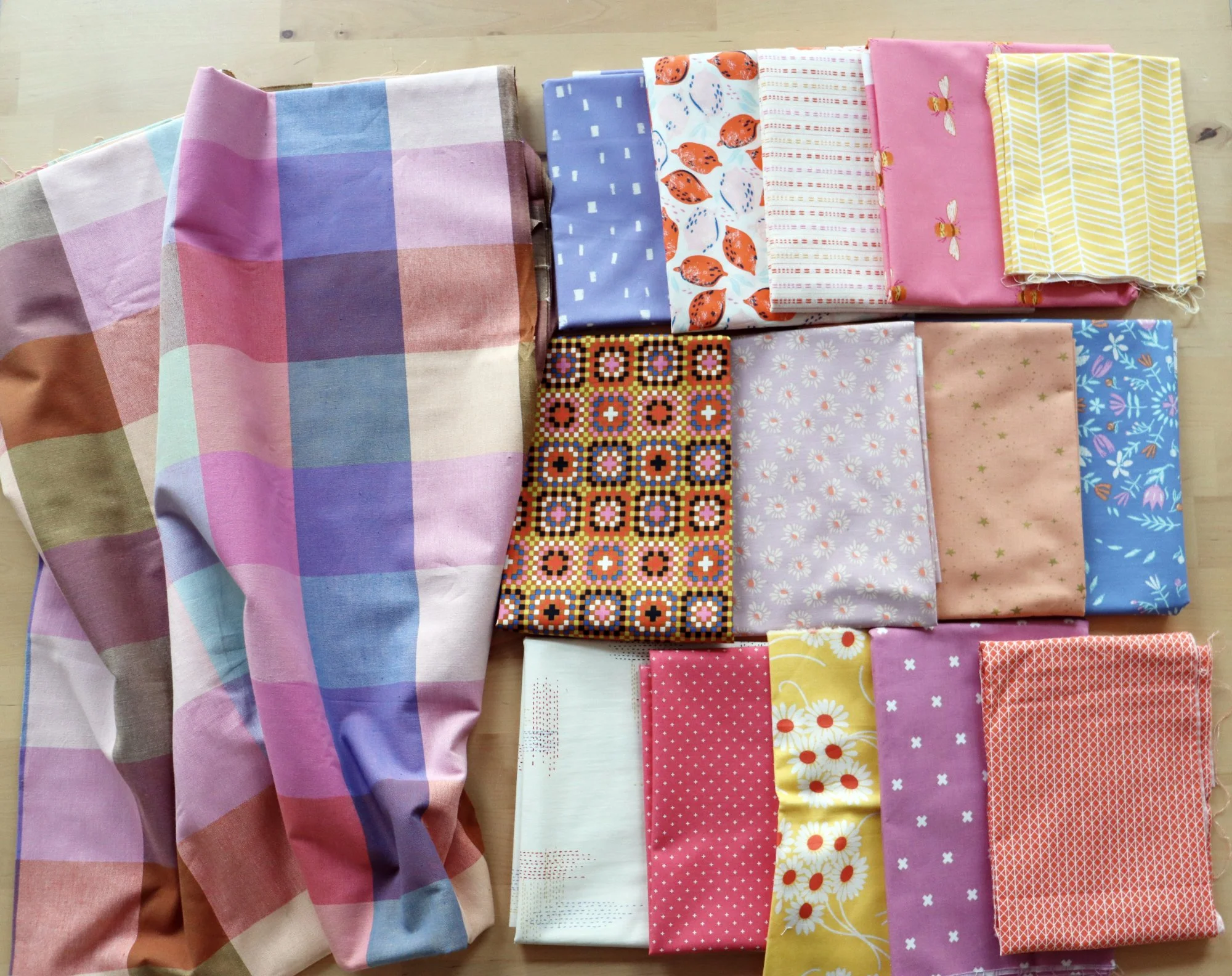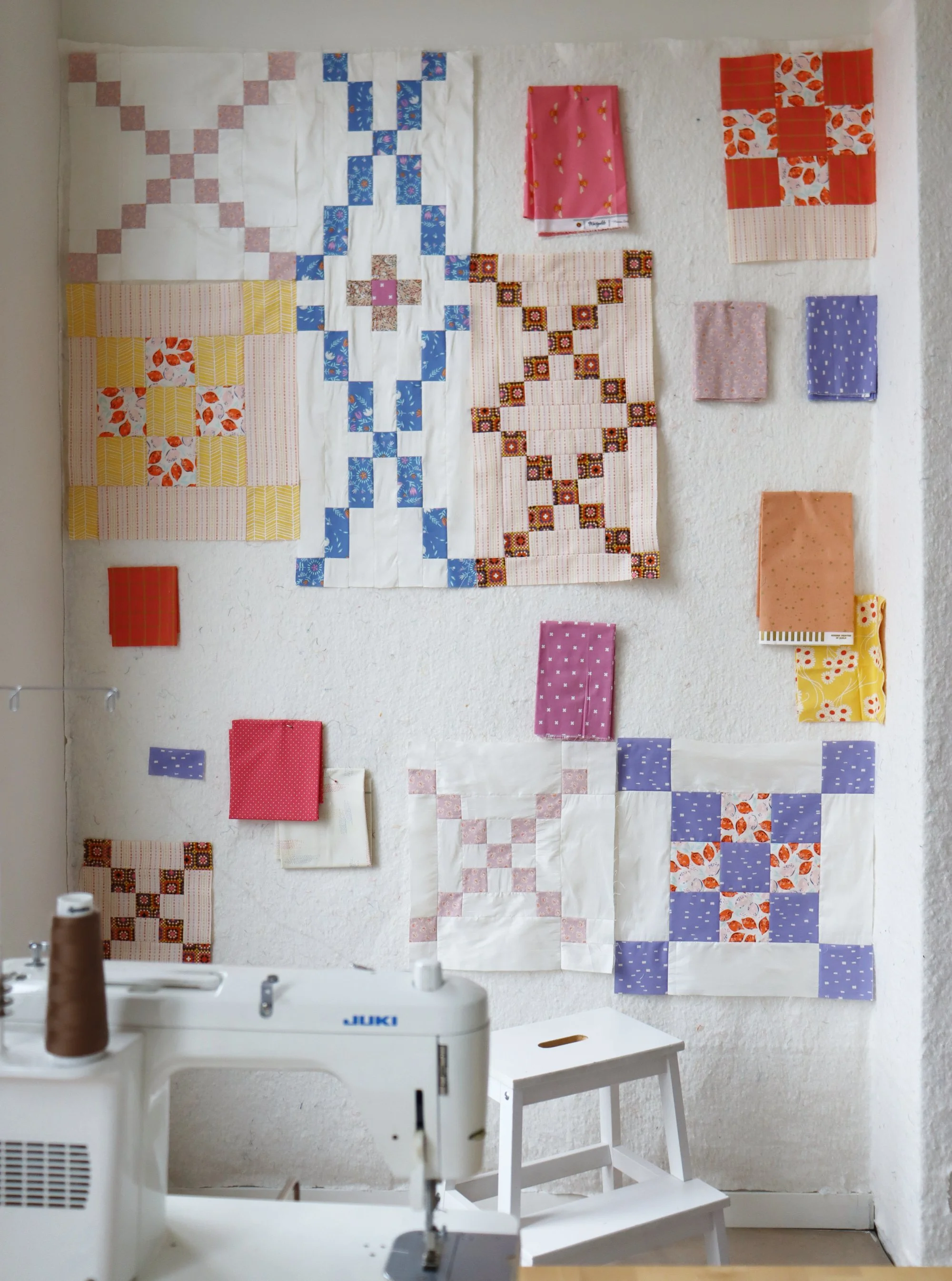 After sewing those first blocks, I decided to go for this busy multicolor print, resembling granny crochet squares. The print has a strong retro vibe, which I’ve heightened by pairing it with the running stitch woven instead of plain white.