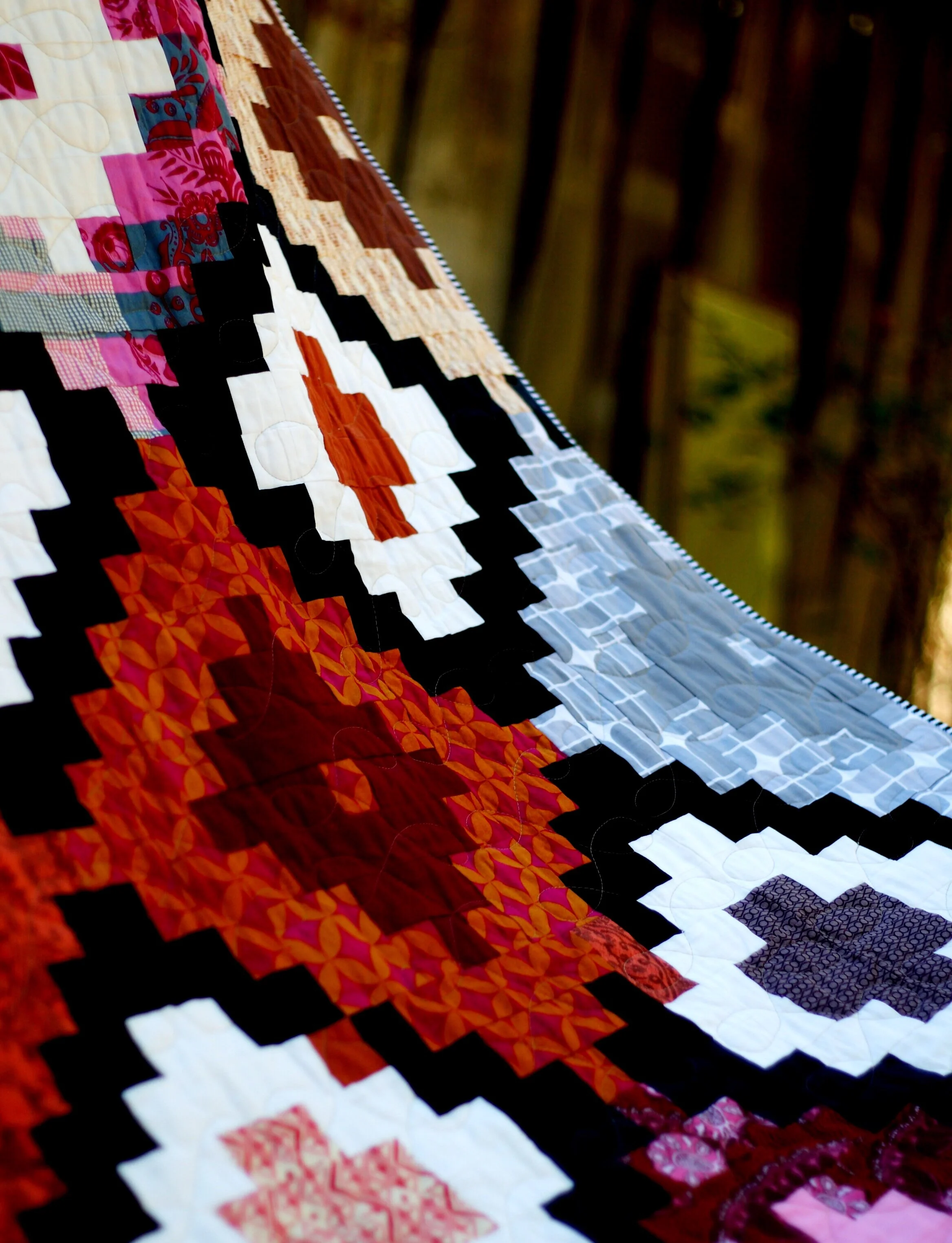 This patchwork design is created with large, 19.5" finished blocks that meet at the edges to create secondary patterns. Even though the patchwork looks intricate, it's actually straightforward to sew with no special seams. Traditionally pieced. Suitable for confident beginners or intermediate quilters.